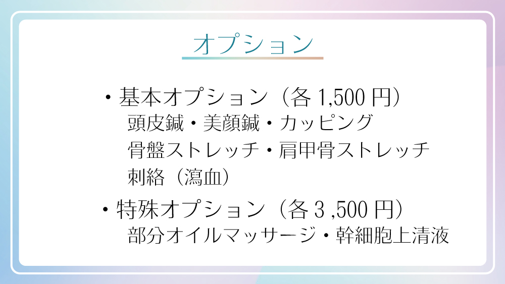 また、追加時間で部分オイルマッサージ、幹細胞上清液を使った鍼灸のご用意もございます。