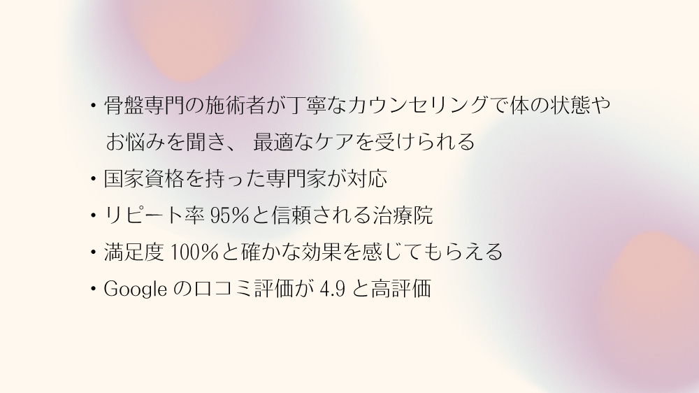 骨盤だけでなく、全身ケアで施術後の満足度が高く、産後のマナートラブルにも対応している点が強みです。