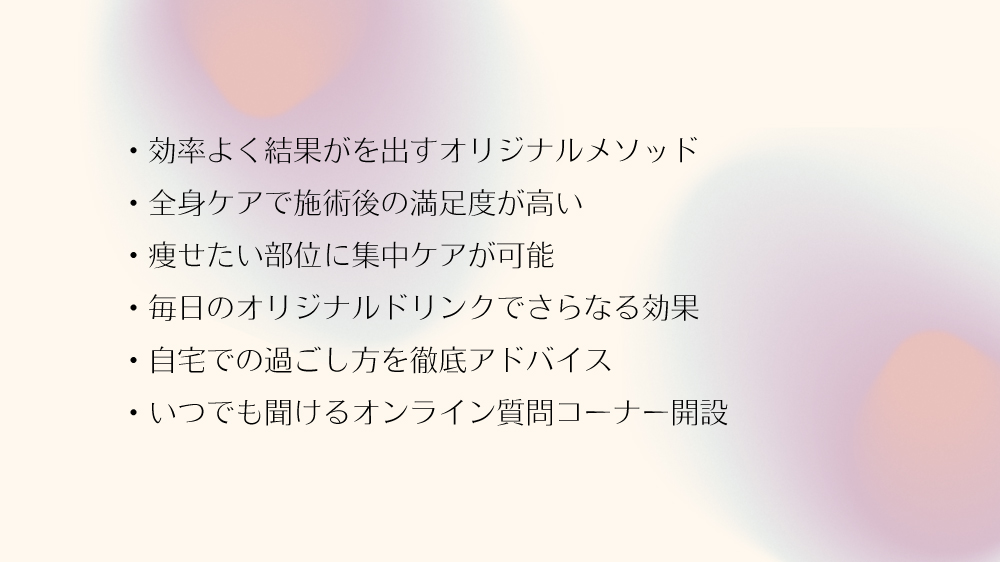 自宅での過ごし方への徹底アドバイスを行い、その中の一環である毎日のオリジナルドリンクでさらなる効果を出します。